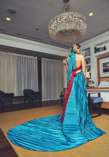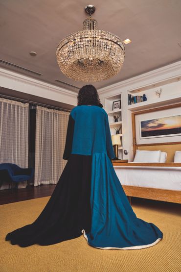 A Tempestade, meaning 'storm' in Portuguese, is inspired by storms and the symbolic nature of storms. The phases of a storm can either be taken literally for what it is or in parallel to be the catalyst for emotional damage and growth from a personal storm. This collection also draws on inspiration from the 16th and 17th centuries while paying homage to the color story of a Miami thunderstorm. The collection incorporates hand embroidery, draping, pleating, and tailoring.