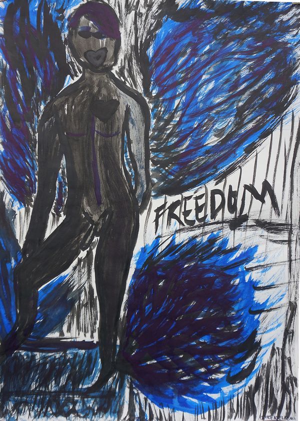 "Lady Justice" 18x 24 soft pastel on paper. Previously on view at the Museum at FIT in New York, New York.